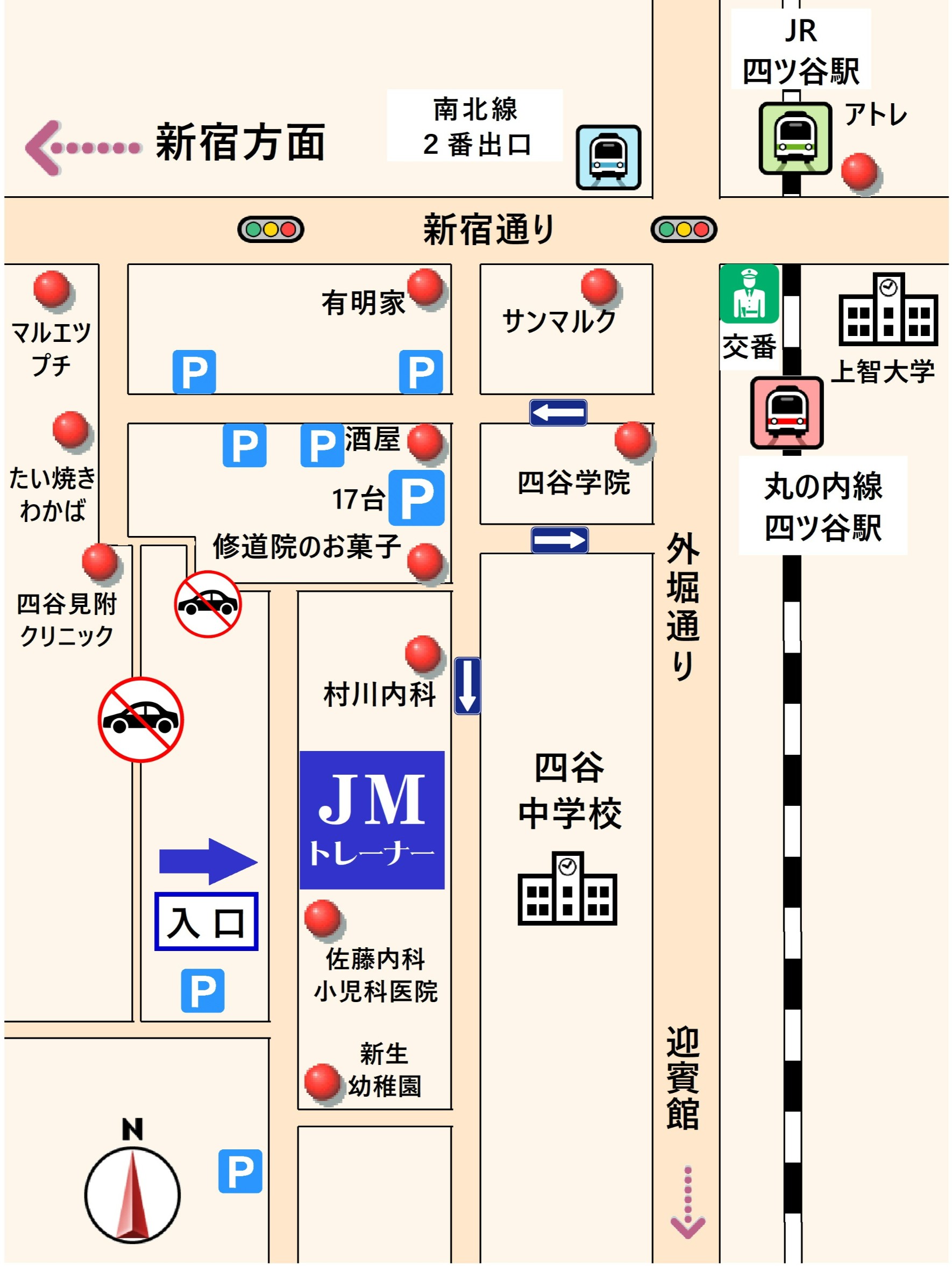四ッ谷駅近くになります。駐車場はありませんので近くの駐車場のご利用をお願い致します。
